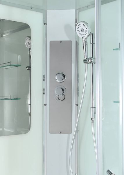 Стильная душевая кабина AvaCan сочетает в себе высокую функциональность, практичность и надежность. При изготовлении применяется безопасное закаленное стекло, надежно фиксируемое алюминиевым профилем. Профиль сделан из алюминия повышенной прочности. Сборка без силикона (увеличивает срок службы, защищает от протечек), внутренняя сборка (облегчает установку и ревизию; позволяет установить в ограниченном пространстве и обойтись без демонтажа других сантехнических приборов), смеситель резьбовой (без хомутов). Съемный экран поддона (позволяет осуществлять подключение и ревизию сифона).Двойные металлические ролики дверей (распределение нагрузки на два ролика, увеличивают срок службы). Душевая штанга(позволяет регулировать по высоте ручную лейку), ручная арома-лейка с витамином С (картридж в комплекте,есть возможность замены или удаления картриджа), полочки(из стекла, с ограничителем), сифон с гидрозатвором.