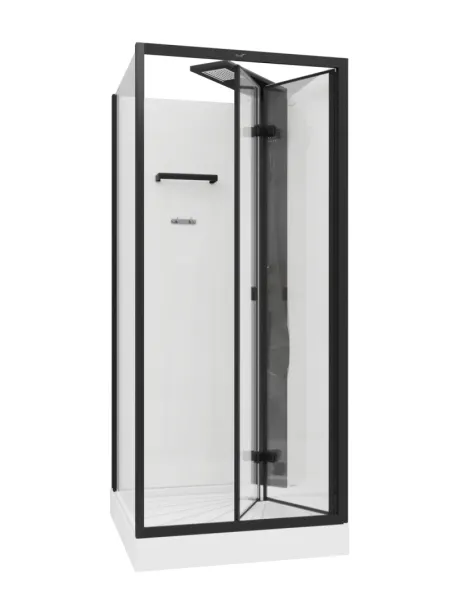 Душевая кабина Ceruttispa BELLA90B 90x90 см чёрныйКабина BELLA90B душевая без крыши Ceruttispa. Размер: 90х90х215-225* см. Поддон белый, акриловый, с бортиком по периметру. Профиля алюминиевые, черного цвета из аннодированого алюминия. Переднее стекло закаленное, прозрачное, толщиной 5 мм. Боковое неподвижное стекло закаленное, прозрачное, толщиной 6 мм. Заднее стекло закаленное, супер прозрачное с белой покраской, толщиной 5 мм. Верхний тропический душ алюминиевый, с регулировкой высоты 5 см + 5 см (регулируется до установки). Смеситель и ручной душ квадратной формы, в цвет профиля. В комплекте сифон анти-запах.