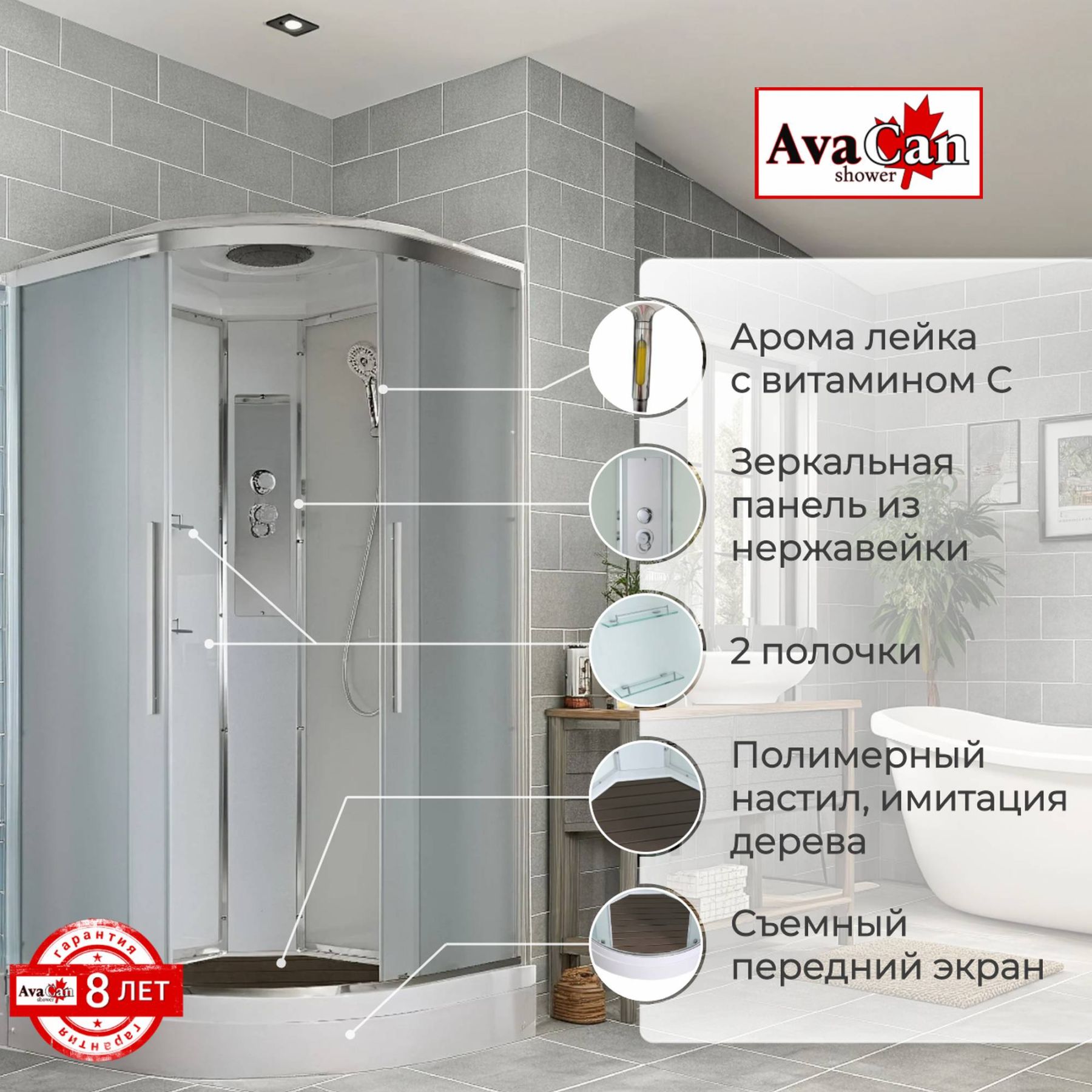 Стильная душевая кабина AvaCan EM2010 сочетает в себе высокую функциональность, практичность и надежность. При изготовлении применяется безопасное закаленное стекло толщиной 5 мм (матовое), надежно фиксируемое алюминиевым профилем. Сборка без силикона (увеличивает срок службы), внутренняя сборка(облегчает установку и ревизию; позволяет установить в ограниченном пространстве), смеситель резьбовой (без хомутов). Съемный экран поддона (позволяет осуществлять ревизию сифона). Цвет профиля хром. Двойные металлические ролики дверей (увеличивают срок службы).В комплекте : душевая штанга, две полочки , тропический (верхний) душ, арома-лейка с витамином С (картридж съемный),полимерная вставка в поддон(имитация дерева),сифон, ручки дверей из нержавейки , двойные ролики .