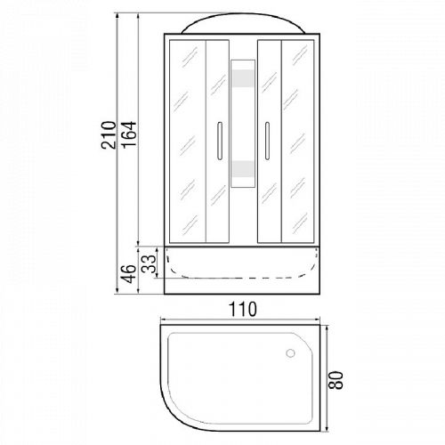 ~ крыша ~ верхний душ ~ вентиляц. отв-я (2шт) ~ цент. стойка ~ ручной душ 3-х позиц. ~ держатель д/лейки ~ полочка ~ смеситель с переключ. режимов ~ сиденье ~ поддон п/кр выс. со/съемн экр.(Н=46см) ~ сифон