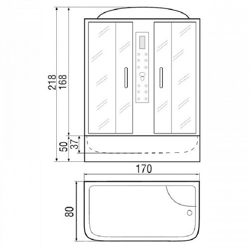 ~ крыша ~ верхний душ ~ вентиляц. отв-я (2шт) ~ цент. стойка ~ ручной душ 3-х позиц. ~ держатель д/лейки ~ полочка ~ смеситель с переключ. режимов ~ сиденье ~ поддон выс. со/съемн экр.(Н=50см) ~ слив-перелив