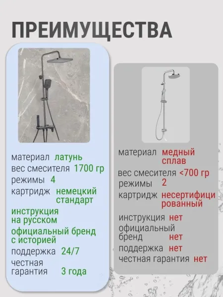 Душевой комплект содержит все необходимое для монтажа. Кроме того, наша душевая стойка с дисплеем и подсветкой имеет простой и быстрый монтаж, благодаря чему вы сможете установить ее самостоятельно без привлечения специалистов. Это позволит сэкономить время и деньги, а также получить удовольствие от процесса создания своего уютного уголка в ванной комнате.