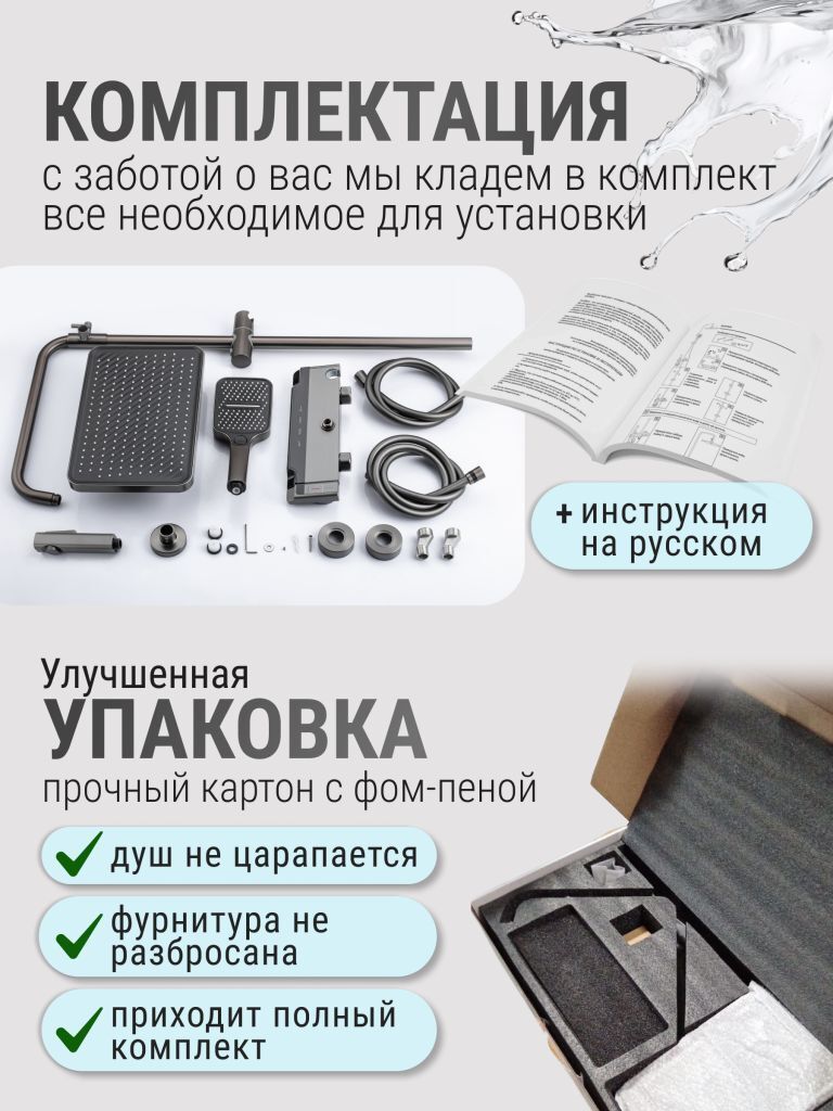 Душевой комплект содержит все необходимое для монтажа. Кроме того, наша душевая стойка с дисплеем и подсветкой имеет простой и быстрый монтаж, благодаря чему вы сможете установить ее самостоятельно без привлечения специалистов. Это позволит сэкономить время и деньги, а также получить удовольствие от процесса создания своего уютного уголка в ванной комнате.