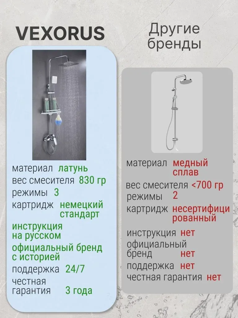 Душевая система с краном бренда Vexorus - это идеальный выбор для тех, кто ценит качество, стиль и комфорт. Представленное оборудование является надежным и долговечным, что позволяет использовать его на протяжении многих лет.