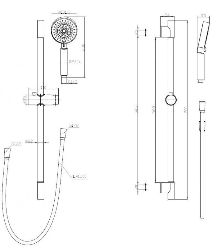 Оснащение: Штанга, регулируемый держатель ручного душа, душевой шланг PVC 150 см, ручной душ 5 режимов, АБС-пластик