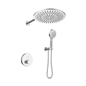Комплект скрытого монтажа для душа датского производителя Black&White в цвете глянцевый хром. Корпус изделия выполнен в форме диска, в который интегрирован термостатический картридж прогрессивного типа для настройки температуры с постоянным давлением, а также кнопочный дивертор для выбора нужного потребителя. В комплектацию входит верхний душ на кронштейне цилиндрической формы и ручная лейка с режимами. Скрытая часть также входит в комплектацию данного изделия.