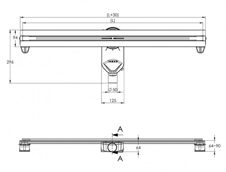 Решетка и декоративные заглушки, нержавеющая сталь AISI 304Комплект регулировки решетки по высоте от 8 до 25 ммСетка для волос, пластикКомплект гидроизоляцииЖелоб водосток, нержавеющая сталь AISI 304Монтажная заглушка, пенопластРегулируемые по высоте ножки, пластикСамопромывной S-образный сифон PPГоризонтальный выпуск D50 H60, пропускная способность 42л/мин, монтаж 360°Монтажный ключ, пластик