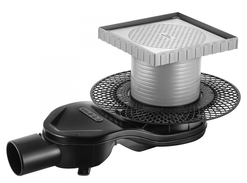 Решетка под плитку, нержавеющая сталь AISI 304Горловина трапа, пластикФланец трапа с переходником, РРМонтажная заглушка, PPСамопромывной S-образный сифон PP:горизонтальный выпуск D50 H60, пропускная способность 42л/мин, монтаж 360°Монтажный ключ, пластик