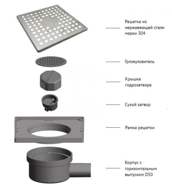 Решетка толщина 0,8 ммНержавеющая сталь AISI 304Горловина трапа пластикКомбинированный затворКорпус PP Горизонтальный выпуск D50Монтаж 360°