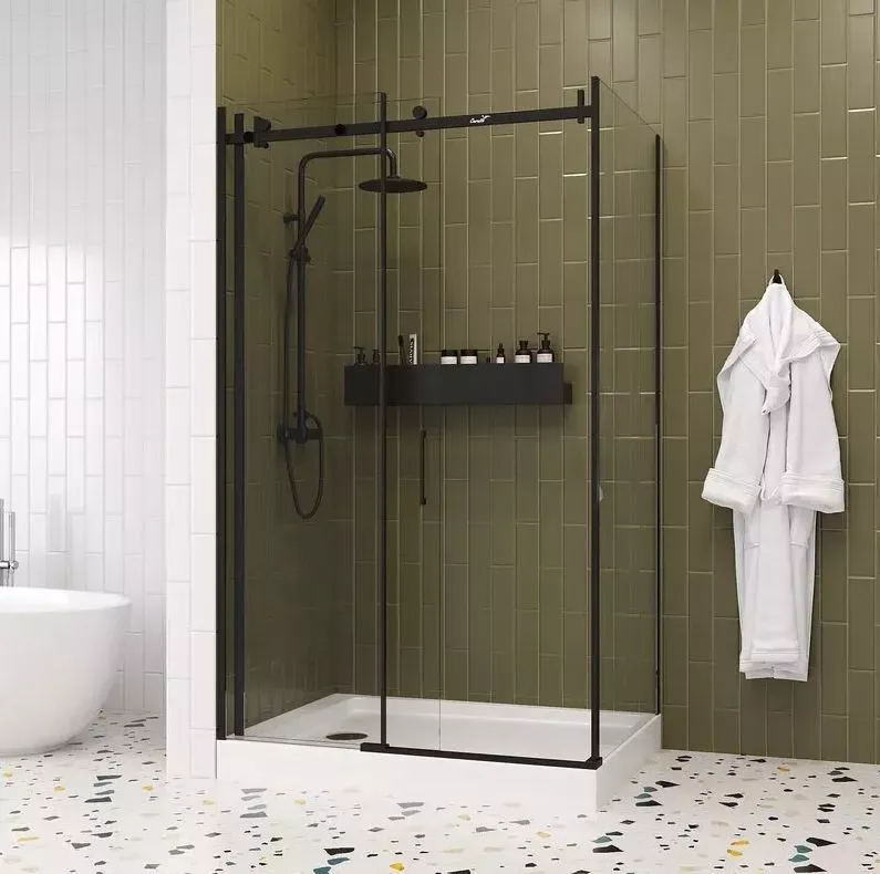 Раздвижная дверь с магнитным замком Soft close. В открытом состоянии створка не занимает полезную площадь в ванной. А магнитный замок обеспечивает плотное закрытие двери и предупреждает попадание воды на пол.