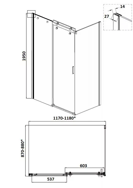 Размеры без поддона: 118х88х195 см