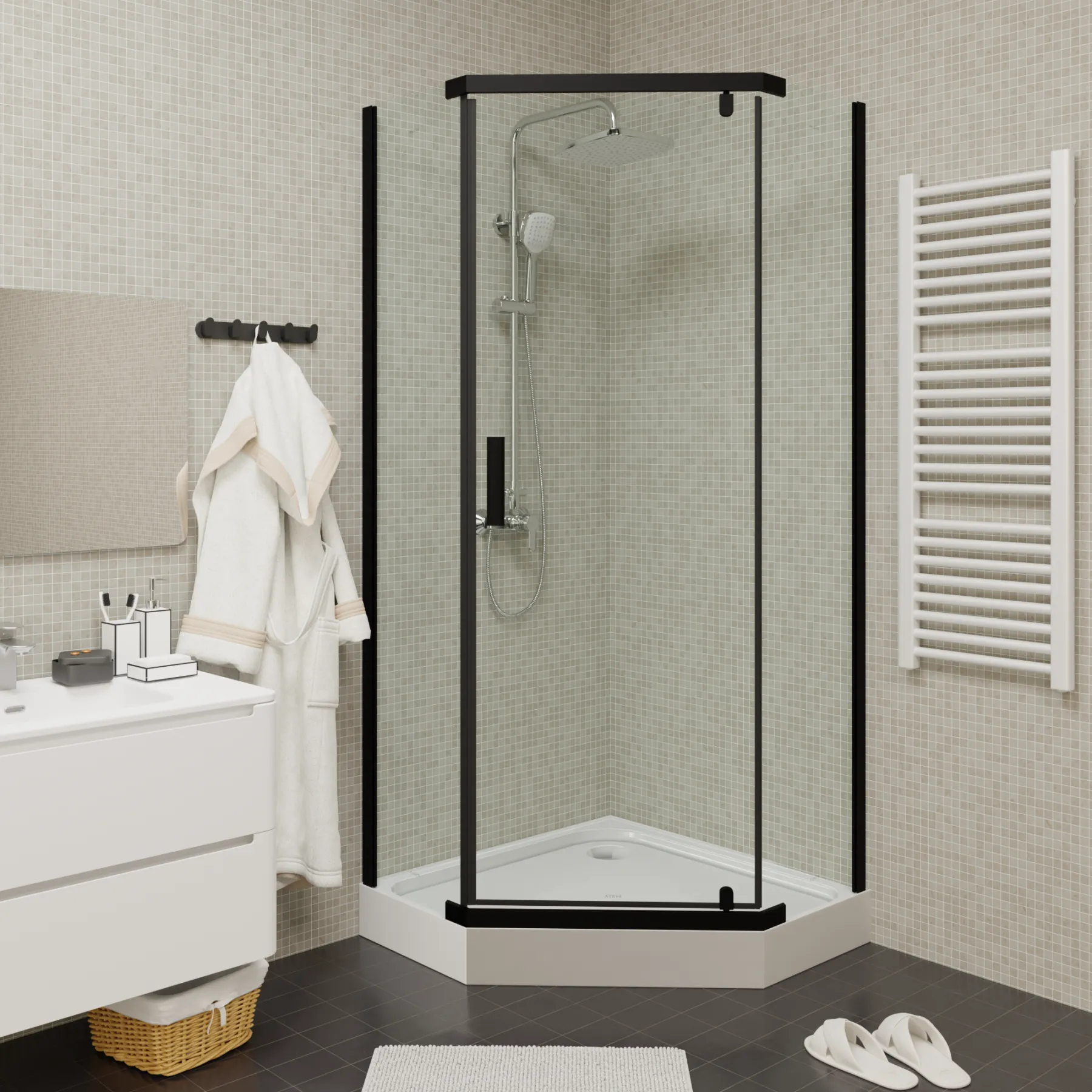 Каркас изготовлен из прочного закаленного стекла, что обеспечивает надёжность и долговечность конструкции. Поддон выполнен из высокопрочного ABS-пластика и имеет оптимальную высоту — 15 см. Это делает использование уголка удобным как для взрослых, так и для детей.