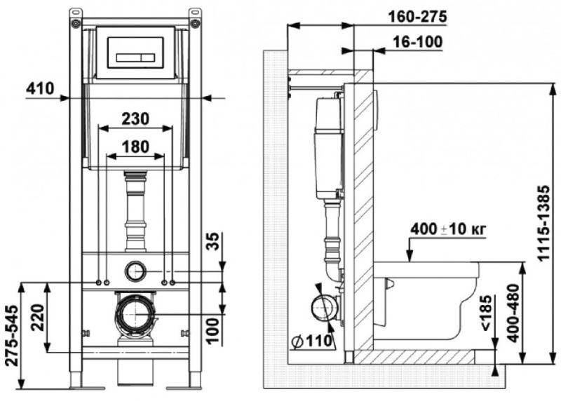 Узкая рама шириной 41 см.Металлический каркас, окрашенный антикоррозийной эмалью.Расчетная нагрузка 400кг. Объём резервуара воды 10 л с тепло- и шумоизоляцией.Подвод воды внутрь резервуара (G1/2 наружная).Объем смыва 3/6 литра с возможностью регулировки.Управление механическое, две кнопки.Межосевое расстояние под шпильки для подвеса унитаза 18 и 23 см. Полный комплект для установки включает в себяшумоизоляционную прокладку и лекало для монтажных отверстий.