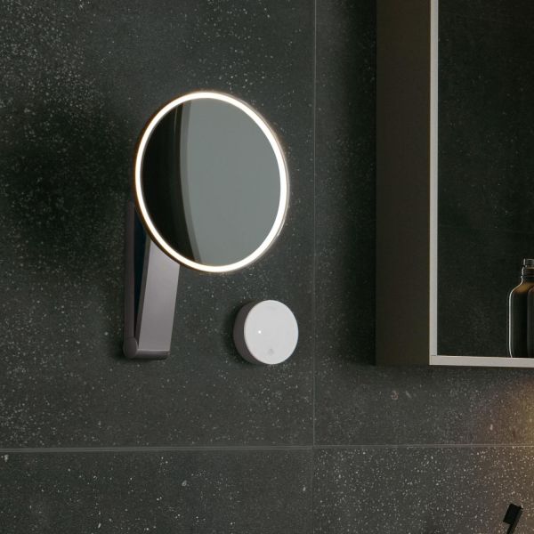 Keuco iLook_move 17612019002 Косметическое зеркало с подсветкой (хром). 5-уровневое переключение цвета подсветки от 2700 Кельвин (теплый белый) до 6500 Кельвин (дневной свет), стеклянная панель управления, электрокабель интегрирован в поворотный кронштейн, настенная модель на кронштейне с шарниром, регулируется в трех плоскостях, одностороннее зеркало, вогнутое, коэфффициент увеличения x 5. Управление: Стеклянная сенсорная панель и светодиодный индикатор. Электроснабжение: подключение к сети через подрозетник, 12 В встраиваемый сетевой блок питания, Напряжение на входе: 220-240 В. Потребление в режиме ожидания: < 0,5 Вт. Подсветка: Светодиод 4,5 Вт (срок работы > 50.000 часов).
