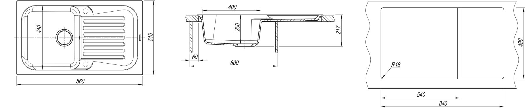 В комплектацию входит: отводная арматура с выпуском и переливом, крепежи, и шаблон для выреза на столешнице.