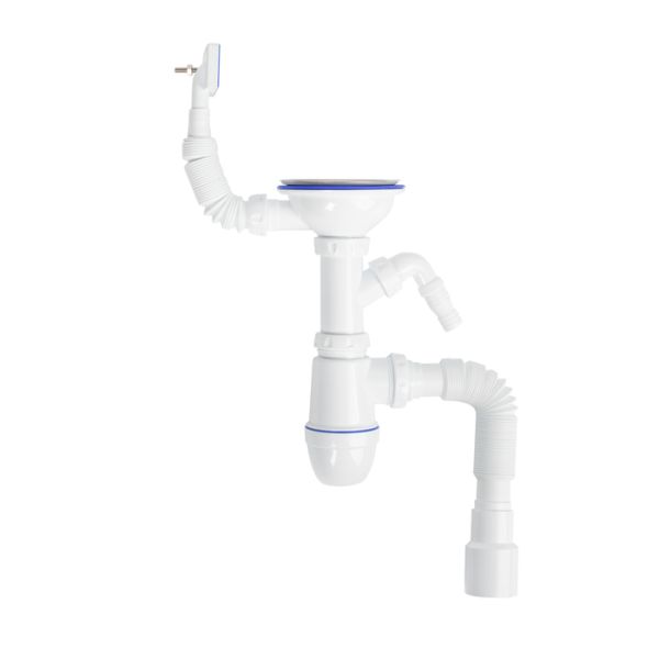 Выпуск из качественного полипропилена выдержит воздействие воды и бытовой химии; сетчатая корзинка из нержавеющей стали, хромированный шток, винт и ручка из латуни.