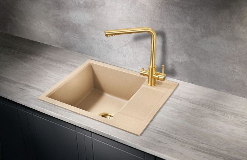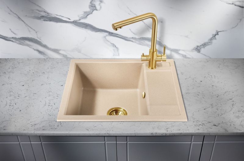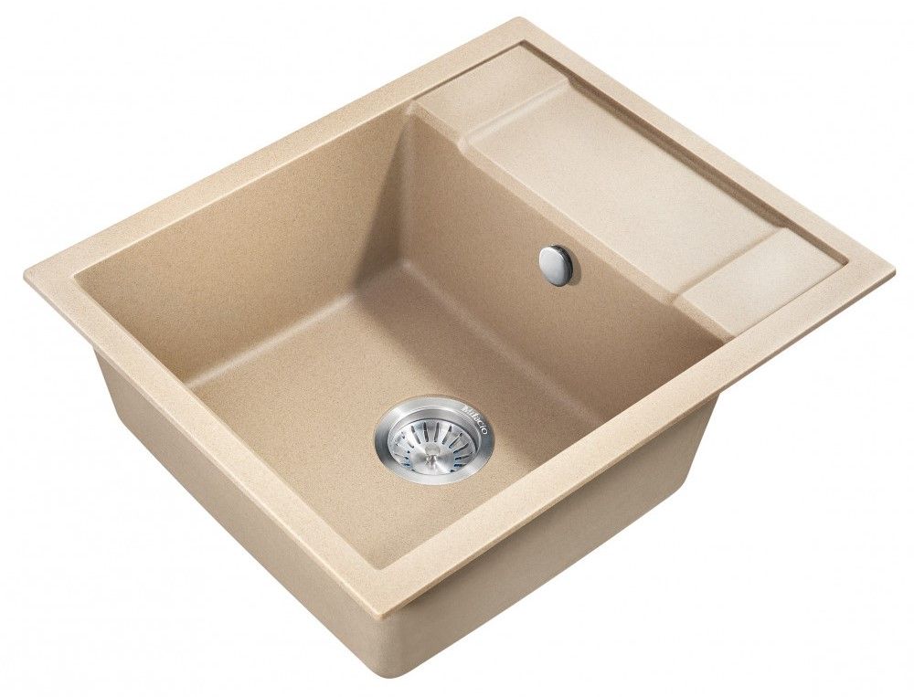 Врезная прямоугольная мойка для кухни из искусственного камня MILACIO Navarra 60 Cuarzo (MC.77074), выполненная в бежевом матовом цвете, станет яркой, привлекающей внимание деталью в вашем кухонном интерьере.
