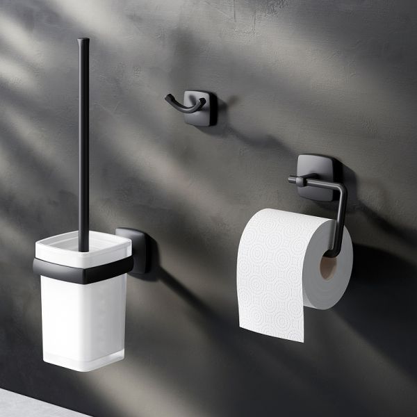 Набор аксессуаров для ванной AM.PM Gem AK90T2003B черныйНабор дизайнерских аксессуаров от AM.PM станет идеальным завершением образа современной туалетной комнаты. Занимая минимум места в пространстве, аксессуары Gem помогут рационально организовать место для хранения и станут стильными акцентами в интерьере. В комплекте: двойной крючок для полотенец, держатель для туалетной бумаги, стойка с туалетной щеткой. Дерзкая и стильная коллекция Gem в черном цвете превращает даже простые аксессуары для ванной комнаты в классные дизайнерские детали, которыми хочется пользоваться каждый день. Форма аксессуаров повторяет линии смесителей коллекции, подчеркивая единую концепцию дизайна. Премиальные детали: массивное матовое стекло прямоугольной формы. Лазерная обработка стыков – ультратонкий шов и 100% защита от влаги.