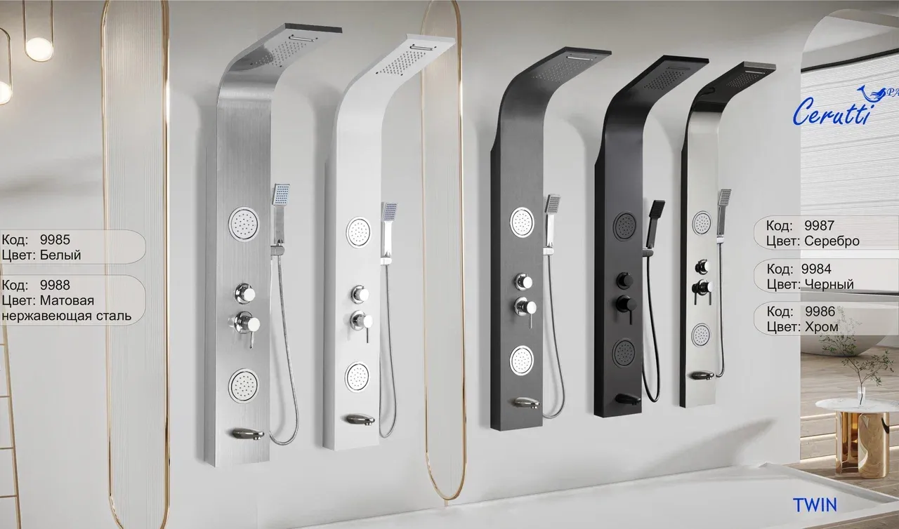 Комфорт ванной комнаты формируется современными элементами обустройства помещения. Поэтому для создания уютной атмосферы необходимо внимательно отнестись к выбору сантехнического оборудования. Сделать вашу ванную комнату не только эргономичной, но и функциональной, поможет душевая панель.Душевые панели становятся все более популярными, так как предлагают роскошные SPA процедуры в комфорте вашей собственной ванной комнаты. Эти изящные и стильные устройства обладают целым рядом функций, которые призваны улучшить ваши впечатления от принятия душа.Также душевые панели являются отличным решением для помещений любых размеров: они компактные, функциональные, удобные в управлении и эксплуатации. Душевые панели не требуют трудоёмкого ухода и являются отличной альтернативой классическим смесителям с ручной лейкой, душевым стойкам или кабины с гидромассажем.Трендовые душевые панели бренда Ceruttispa отличаются высоким качеством, современным дизайном, многофункциональностью, надежностью и долговечностью. Они будут прекрасно смотреться в любом интерьере, а качественный материал исполнения - нержавеющая сталь - прослужит долго, сохранив свои эстетические характеристики. Удобная и многофункциональная душевая панель TWIN BS предназначена для установки внутри душевых уголков, ограждений, а также совместно с ванной.Конструкция панели включает в себя верхний и ручной душ, а также держатель для аксессуаров. Излив оснащен аэратором, который снижает расход воды легко очищается.Внимание! Производитель оставляет за собой право вносить изменения в конструкцию и комплектацию моделей без предварительного уведомления!Особенности: