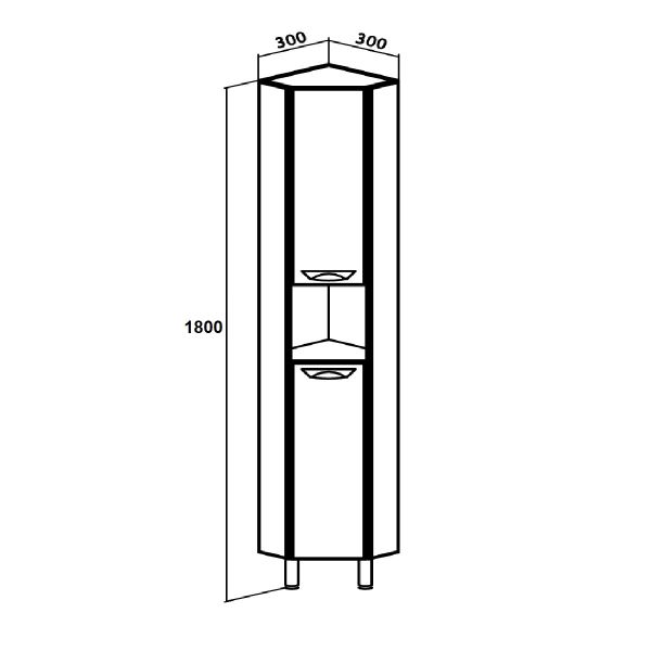Шкаф-колонна угловой с двумя распашными дверками и открытой нишей посередине. В нижнем и верхнем отделениях - по одной внутренней полке. Петли со встроенным доводчиком, ручки - 2шт, ножки хром - 2 шт, ножка пластик -1шт. Универсальный.