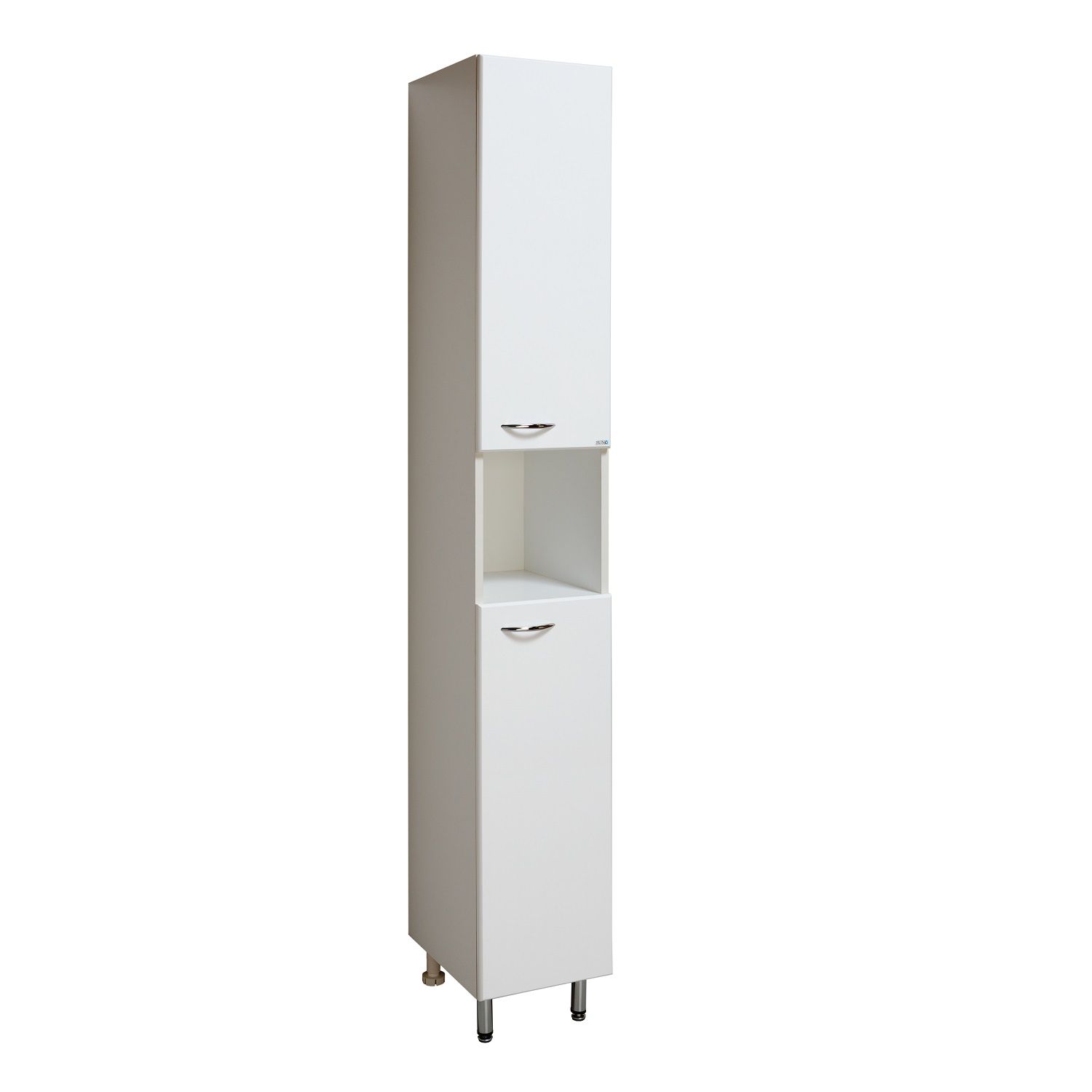 Шкаф-колонна напольный с двумя распашными дверками и открытой нишей посередине. В нижнем и верхнем отделениях - по одной полке. Петли со встроенным доводчиком, ручки - 2шт, ножки хром - 2 шт, ножки пластик -2шт. Универсальный.