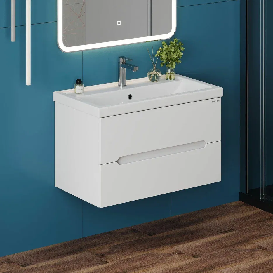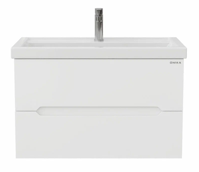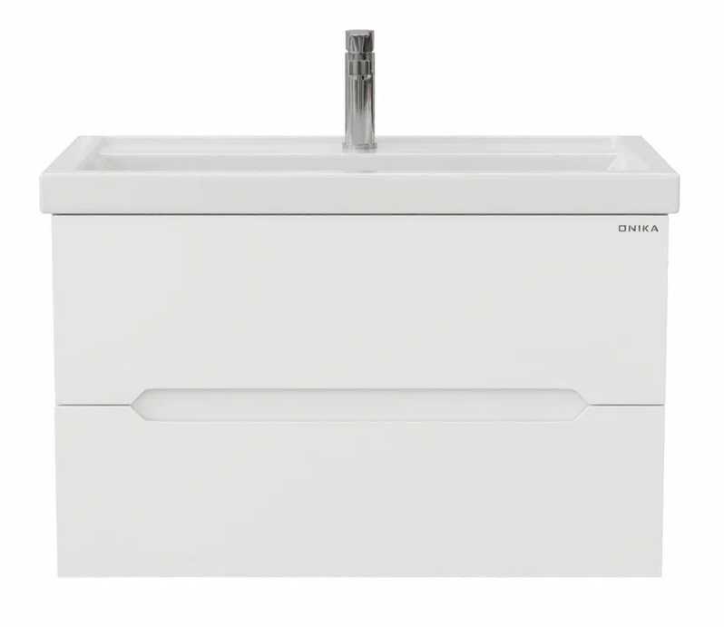 Подвесная тумба под раковину Onika Айленд 80 сочетает в себе стильный минималистичный дизайн, белую глянцевую поверхность и высочайшее качество исполнения.