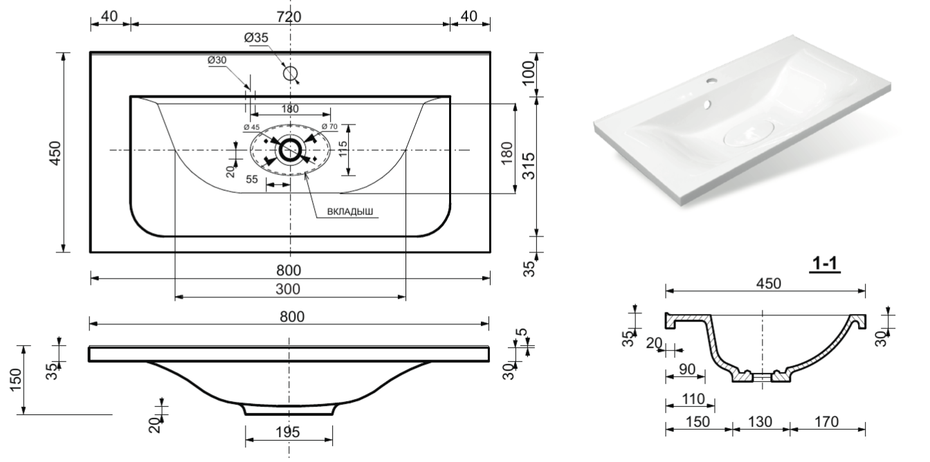 - Отверстия под смеситель:1