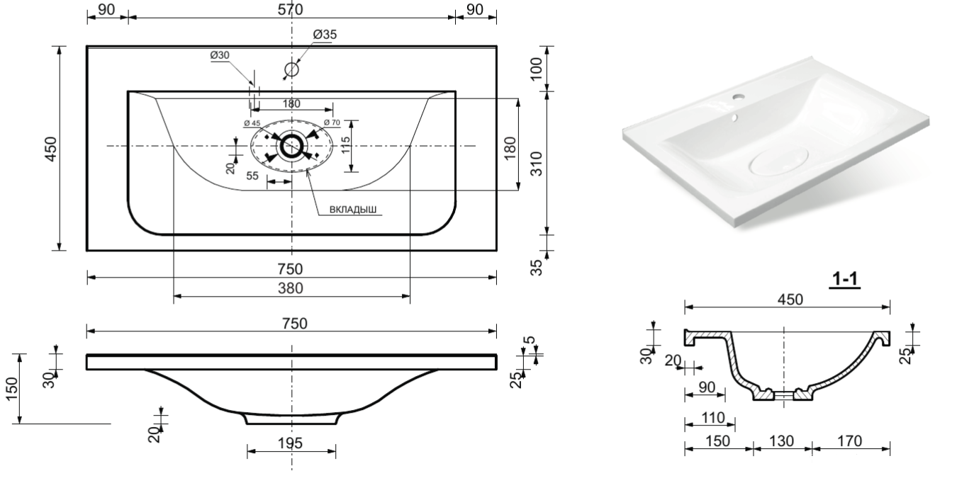 - Отверстия под смеситель:1