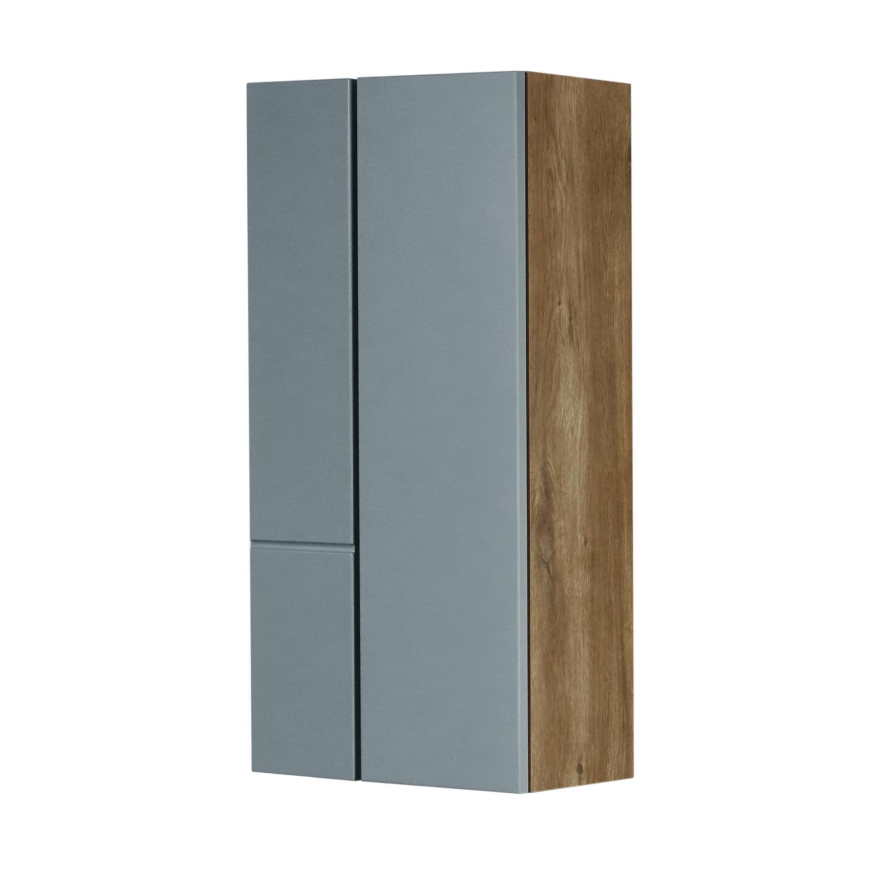 - Дизайн шкафчика повторяет тумбу-умывальник: фасады в матовой пленке фьерд сочетаются с корпусом в декоре дуб рустикальный