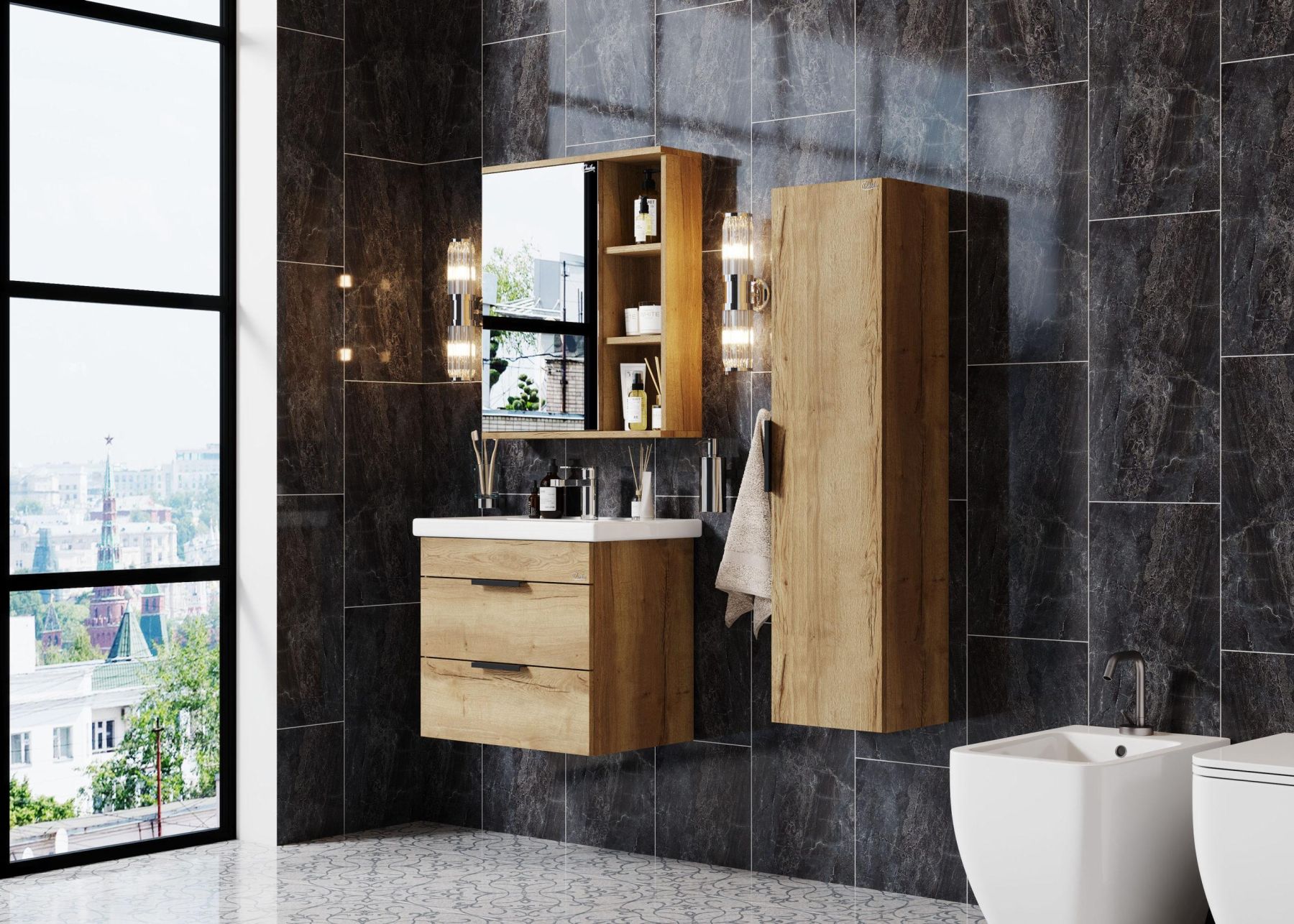 Роскошная текстура и натуральный цвет дуба подарят помещению дыхание природы и привнесет в ванную комнату ощущение гармонии.