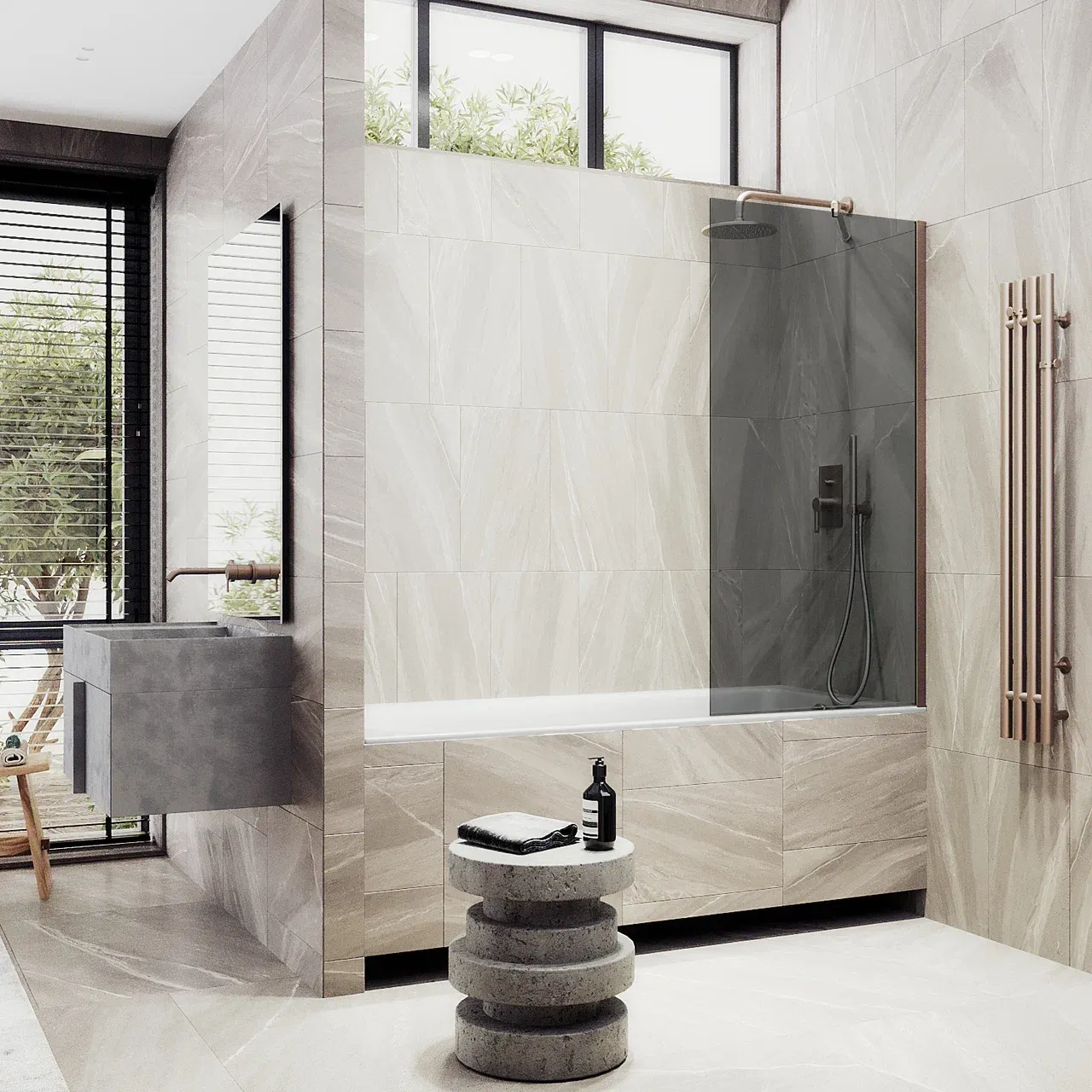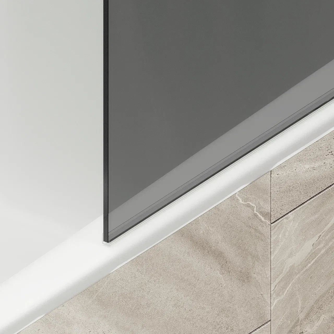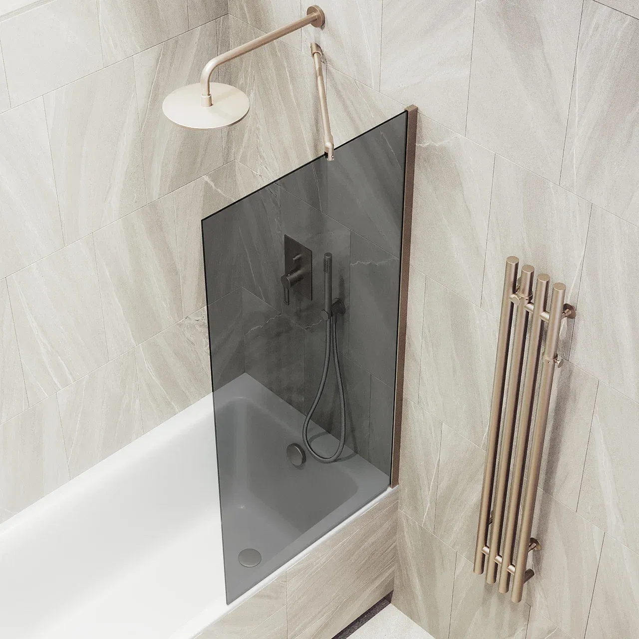 Монтаж осуществляется с помощью алюминиевого профиля, что обеспечивает надежность крепления и безопасность использования стеклянной перегородки для ванной. Также, шторка оснащена специальным уплотнителем, который предотвращает попадание воды на пол ванной комнаты. Закаленное стекло, цвет Графит, толщина 8 мм 1400х300 мм - 1 шт.