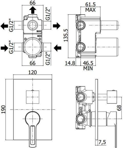 Смеситель встраиваемый для душа на 3 выхода с накладкой нерж сталь 120х190мм.девиатор-картридж, 3 положения+3 комбо, Черный матовыйСмеситель для душа Paffoni Ringo RIN019NO/M (с внутренней частью) предназначен для душа. Своим сдержанным дизайном и колористикой он внесет в интерьер помещения особое настроение, подчеркнув его своеобразие. Он выполнен из надежного материала латунь/Нержавеющая сталь, который не окисляется, а потому прослужит не создавая проблем. Модель является оптимальным примером соотношения цена/качество. Управление в смесителе предусмотрено однорычажное, что порадует любителей такого типа смесителей. Высокую работоспособность и основательность смесителю гарантирует керамический картридж, отличительной чертой которого является беспроигрышная конструкция - залог четкой работы в течение долгого времени. Не зря гарантия на смеситель – 5 лет, в течение которого производитель Paffoni заверяет в его бесперебойной работе. Форма излива в смесителе - нет, а тип - нет. При покупке учтите, что подводка у смесителя жесткая, что важно для его подключения.