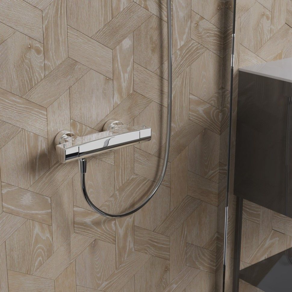 Авторская коллекция итальянского дизайнера Mirko Bosio - NOVE. Смеситель для душа с термостатом выполнен в акцентной геометрической форме, что можно отнести как к нестандартному конструктивному решению, так и к элементу шика. Термостат позволяет устанавливать нужную температуру и не зависеть от перепадов давления воды. Дизайн смесителя поддержит скандинавский стиль оформления ванной комнаты или любое иное, выбранное вами, направление минимализма.