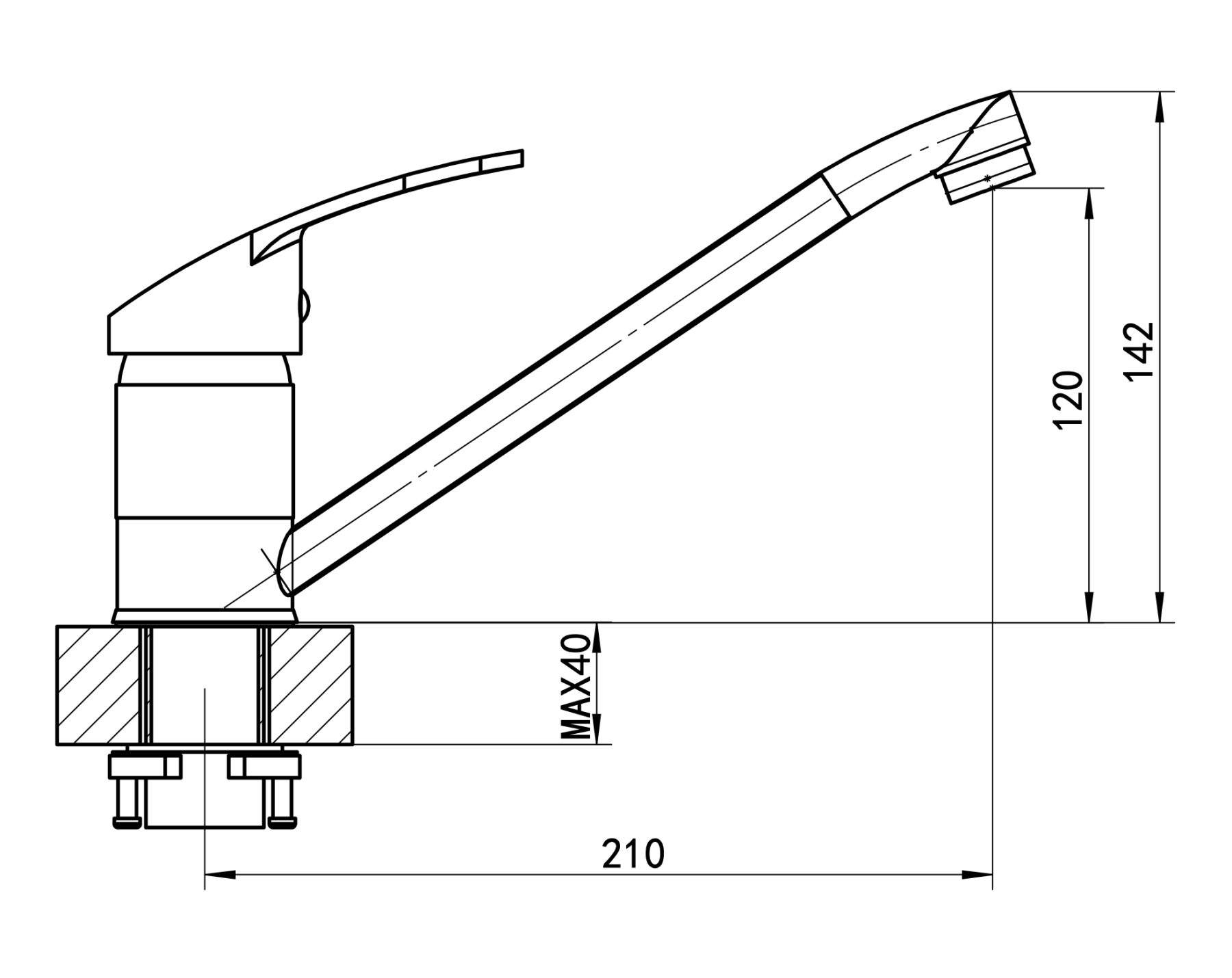 Смеситель однорычажныи? с низким изливомМатериал - материал корпуса латунь, материал излива нерж. стальПоворотныи? изливКерамическии? картридж 40ммГибкая подводка 50 см