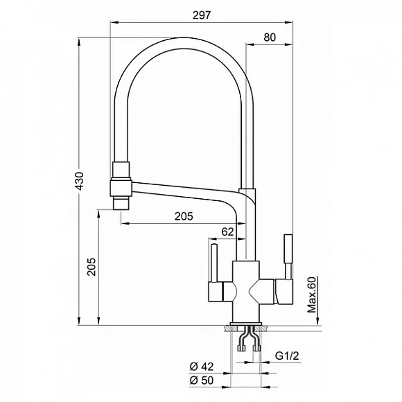 Смеситель для кухни. Цвет-черный. В комплект поставки входит: смеситель, гибкая подводка, комплект креплений, переходник для подключения фильтра с питьевой водой