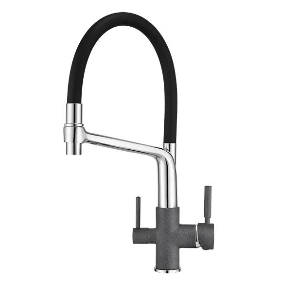 Смеситель для кухни. Цвет-графит. В комплект поставки входит: смеситель, гибкая подводка, комплект креплений, переходник для подключения фильтра с питьевой водой