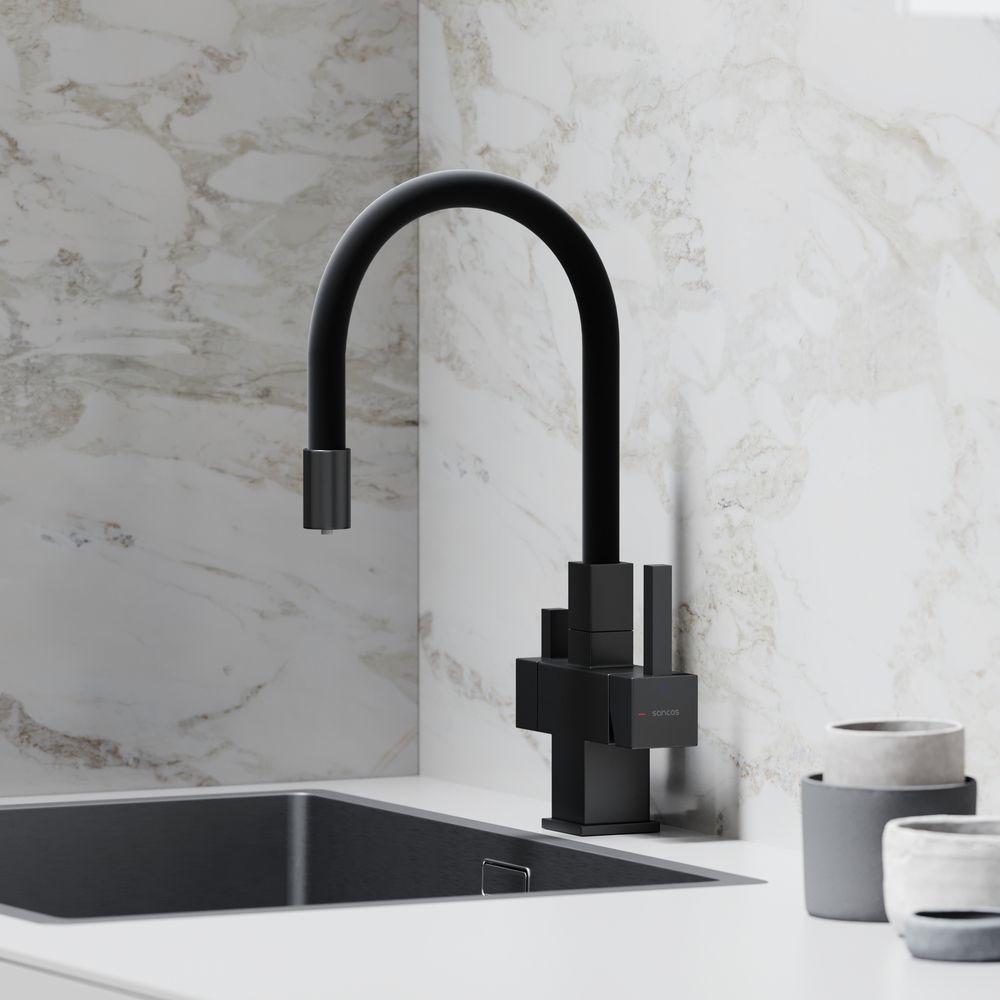 Смеситель для кухни SANCOS Arno с гибким изливом и возможностью подключения фильтра для воды, цвет матовый черный, арт. SC4005MBФункция "Холодный старт" - при включении смесителя активируется холодной поток, для экономии горячей водыАэратор, гибкая подводка, ключ и крепления для монтажа
