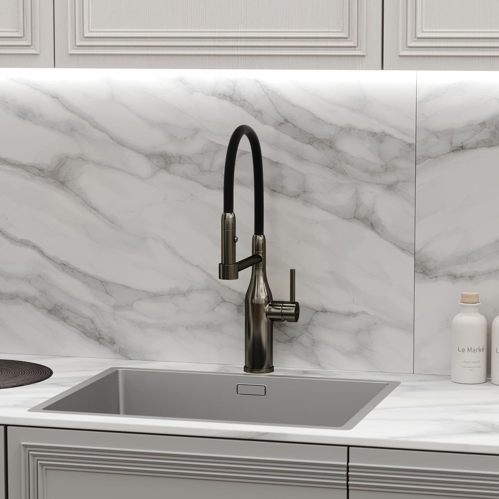 Смеситель для кухни SANCOS Pride с гибким изливом, цвет вороненая сталь, арт. SC4011GGС возможностью регулировки температуры водыАэратор, гибкая подводка, ключ и крепления для монтажа, ключ для обслуживания аэратора