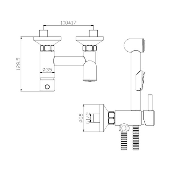 Гигиенический душ со смесителем Rossinka X X25-52. Аксессуары в комплекте (шланг 1,2 м, лейка для биде с нажимным механизмом). Присоединительная группа (эксцентрики с отражателями) для вертикального крепления.