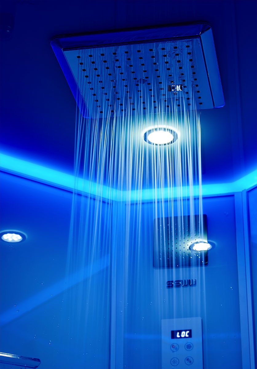 Центральная панель – белое стекло с накладкой из нержавеющей стали с силиконовыми форсунками и смесителем из латуни;