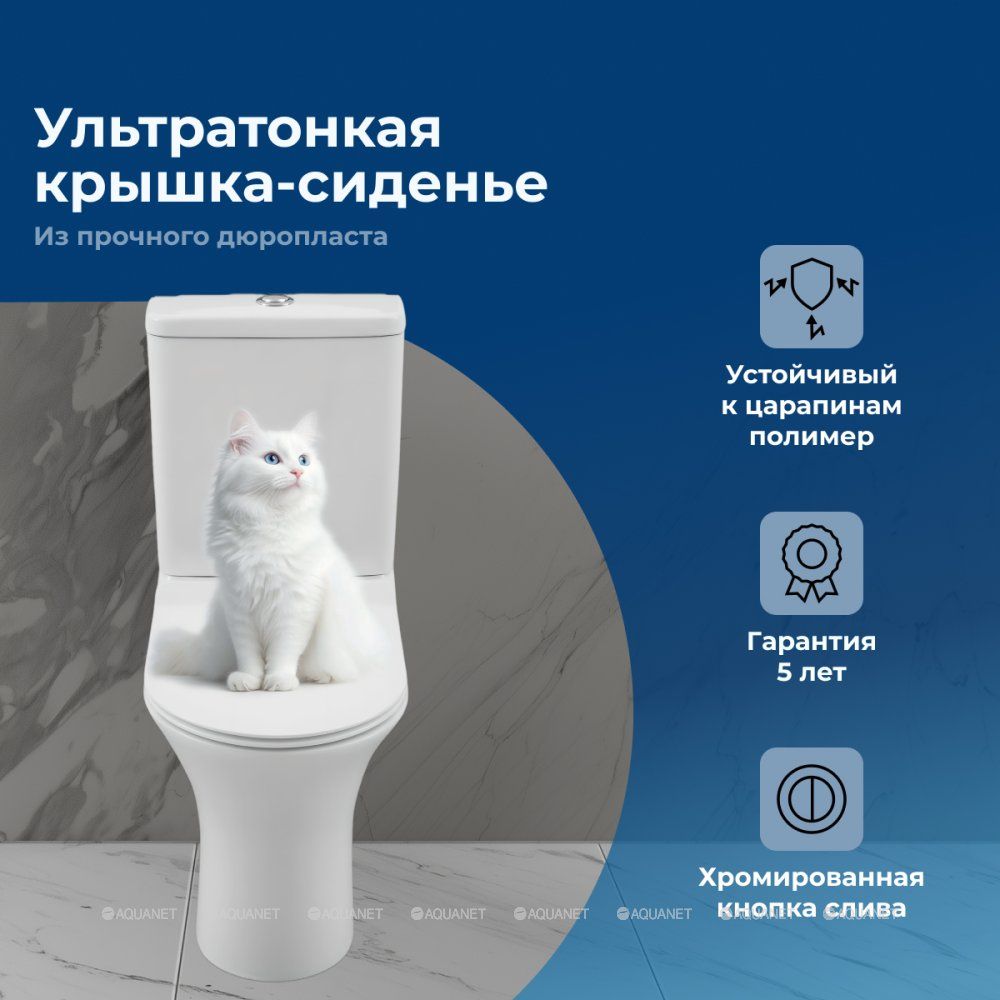 Унитаз с бачком, арматурой бачка с кнопкой и сиденьем Особенности:
