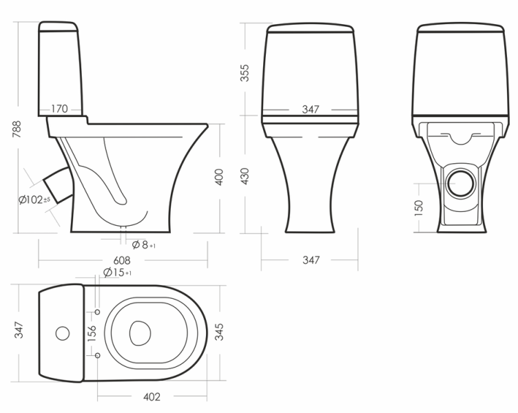 Размеры унитаза-компакта: 347 x 608 x 788