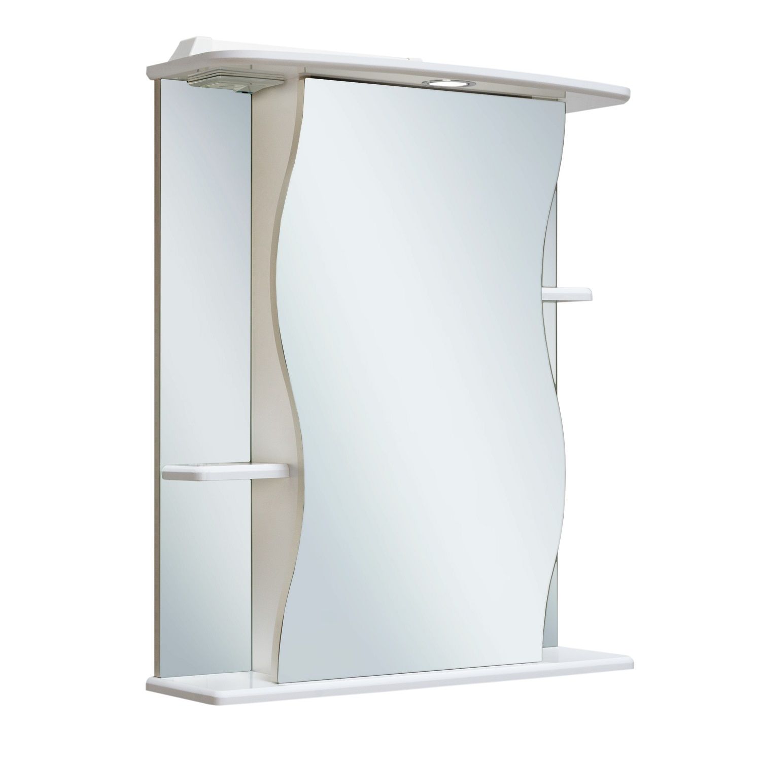 Зеркальный шкаф оборудован одним врезным светодиодным светильником 220В и розеткой с выключателем. По центру - шкаф с фигурной зеркальной дверцей и двумя внутренними полками, справа и слева - по одной открытой полке. Петли с доводчиком. Выпускается только в правом исполнении.