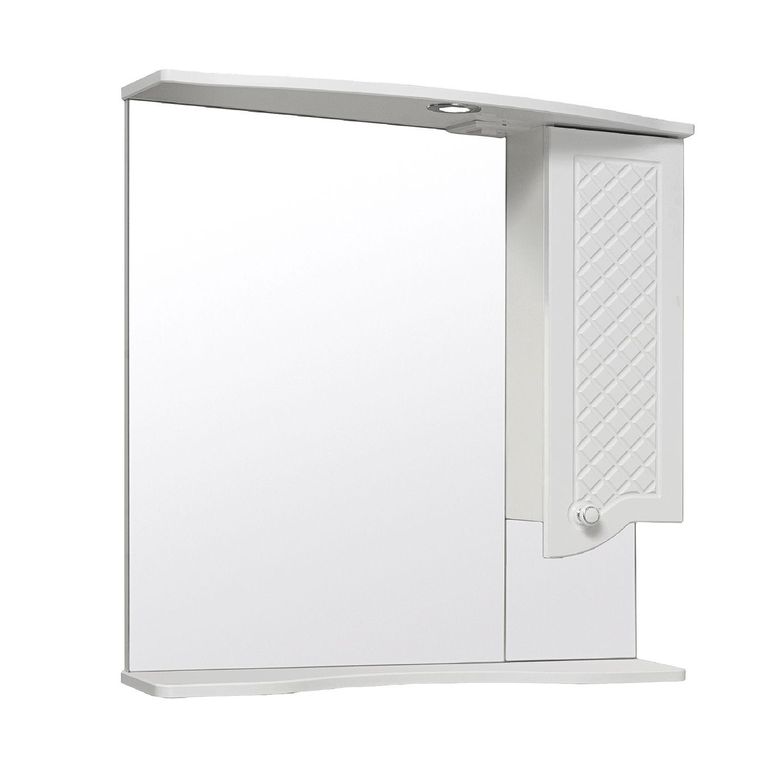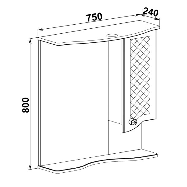 Зеркальный шкаф оборудован одним врезным светодиодным светильником 220В и розеткой с выключателем. Справа - шкафчик с распашной дверцей и одной внутренней полкой. Под зеркалом - нижняя полка. Петли со встроенным доводчиком, ручка - 1шт. Выпускается только в правом исполнении.