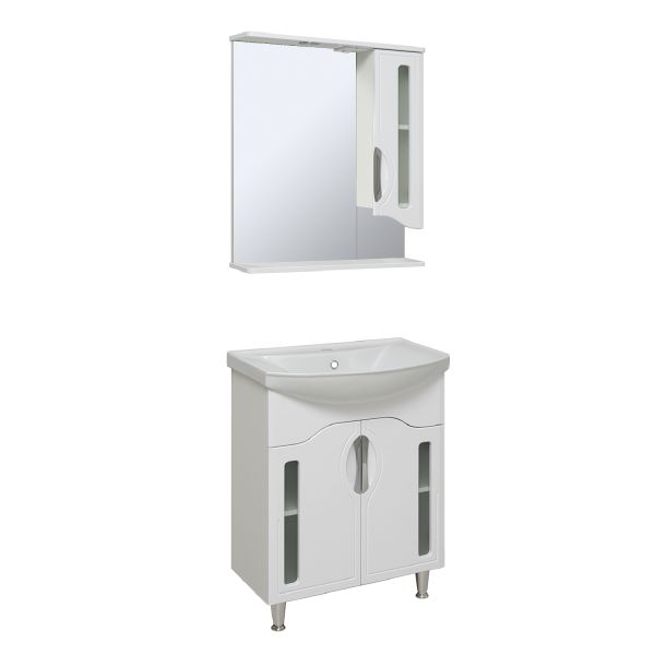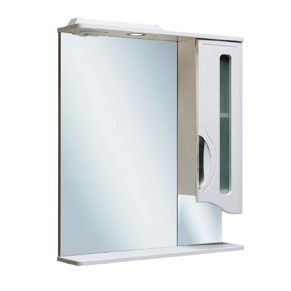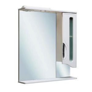 Зеркальный шкаф оборудован одним врезным светодиодным светильником 220В и розеткой с выключателем. Справа - шкафчик с распашным фасадом со стеклянной вставкой. Внутри - одна встроенная полочка. Петли со встроенным доводчиком, ручка врезная- 1шт. Выпускается только в правом исполнении.