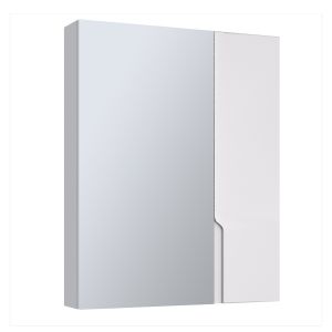 Зеркальный шкаф без подсветки c двумя ассиметричными дверками, одна из которых зеркальная, а вторая - белая. Внутри шкафа - две горизонтальные  полки.  Петли со встроенным доводчиком.