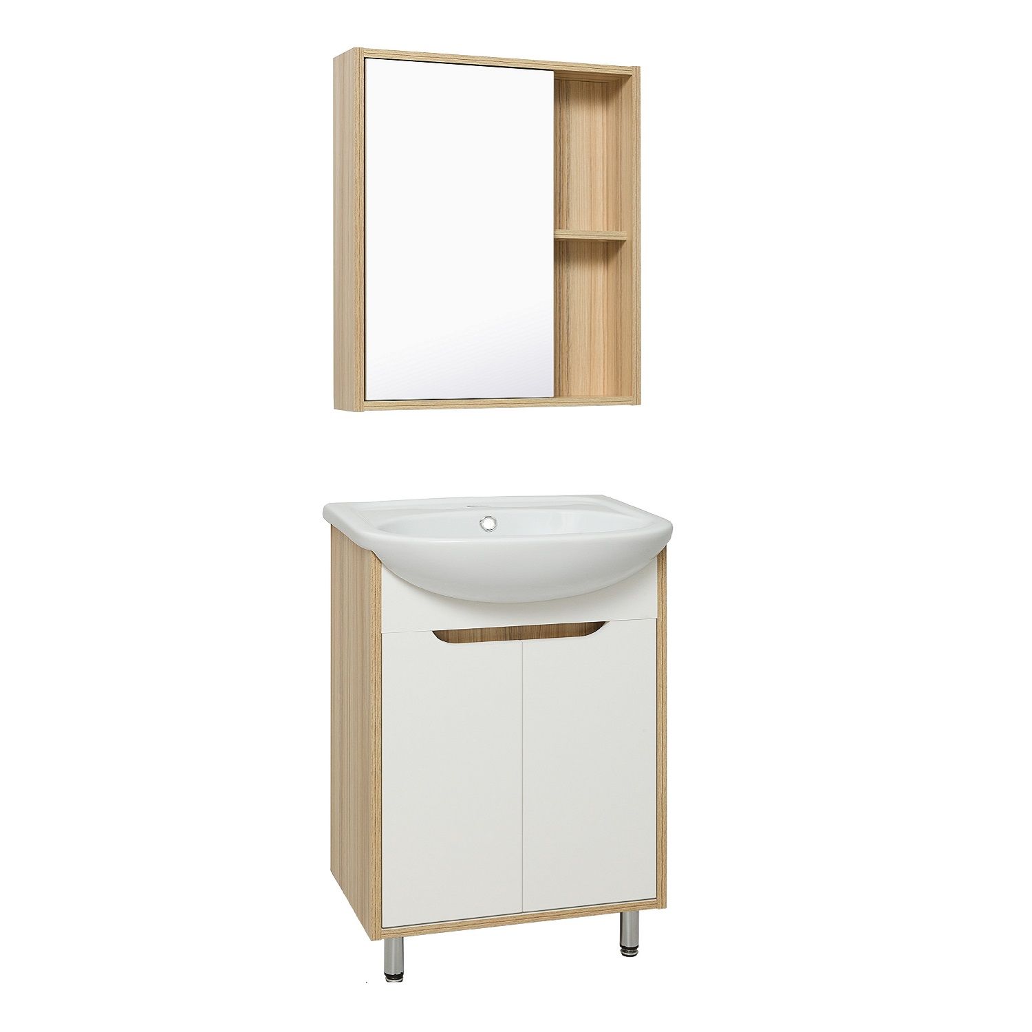 Зеркальный шкаф без подсветки с одной распашной дверкой и открытыми полками (слева или справа, зависит от установки). Внутри шкафа -одна внутрення полка. Универсальный.